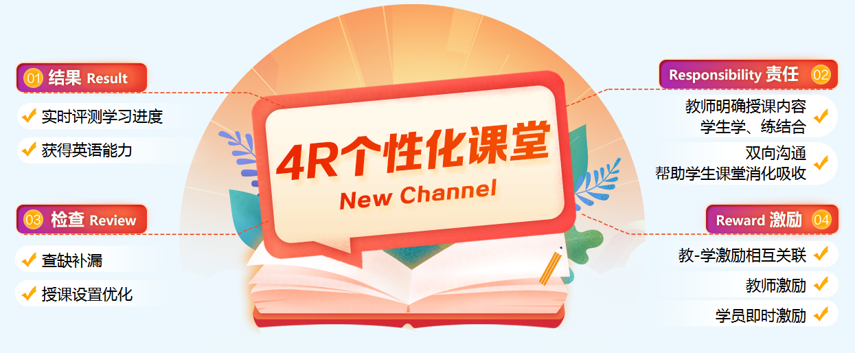 4R,代表着Result (结果)、Responsibility (责任)、Review (检查) 和Reward (激励)。四者有机结合,形成“以结果为起点,又以结果为归宿” 的科学、实用的系统。 新航道将4R系统运用于个性化课堂,把复杂的问题简单化、简单的事情量化、量化的事情标准化,输出学员专属解决方案。 |